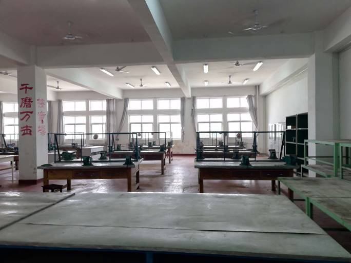 钳工加工实训室配有50套实训设备,价值数万元,可供50人同时进行钳工实习。实训室设备包括:钳工工作台20台,配有50个台虎钳,2个划线工作台,2台台钻,还有锯、锉、直角尺、高度尺、丝锥、板牙等一系列钳工工具,并配有工具箱,具备较强的钳工实习实训能力。实训内容主要有划线、锯削、锉削、磨削和装配等钳工的基本操作、常用量具的使用等。可供机电一体化技术、机械设计与制造、汽车检测与维修、计算机辅助设计专业进行钳工实训。