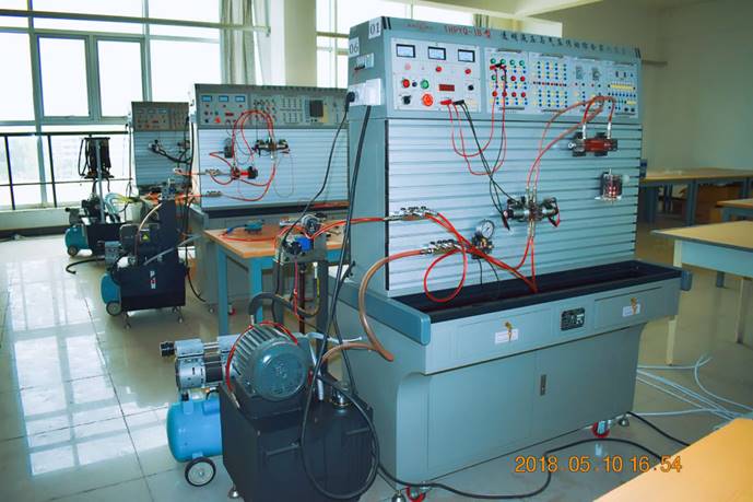 主要设备有亚龙YL-218-Ⅱ型PLC控制的液压与气动实训装置12套。可完成实验或实训项目有:各种常见液压泵、缸、阀等元件的结构原理演示、典型液压回路演示、典型液压、气动元件的性能测试(静态)、液压气压传动基本回路连接、可编程控制器PLC实验。